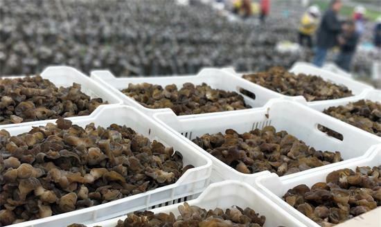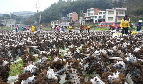 3月20日,笔者在三穗县款场乡等溪村食用菌种植示范基地看见工人们正忙得热火朝天,村里30余名老少妇女纷纷拿起木耳菌棒,不断向菌筐里投入黑木耳,有的忙采摘、有的装车,基地里一片繁忙。