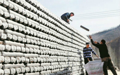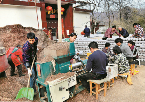 发布时间:2018-03-25日前,河南省洛阳市汝阳县十八盘乡干里村的菇农们正忙着装袋料香菇,为今春及时种植香菇做准备。