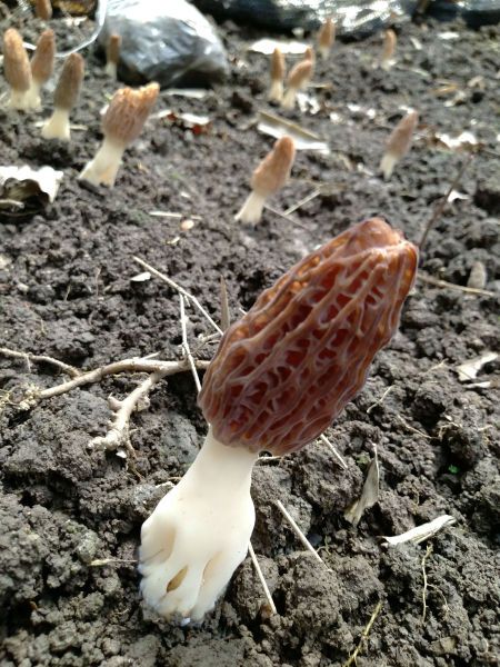 在一个隐秘的小山谷中,数百平方米的区域内足足有上千个可爱的菌菇在生长。菌菇的边上还有大量白白的菌丝在发育,用手指动一下它们会像蒲公英一样飘扬起来,它们都将成为下一批羊肚菌。