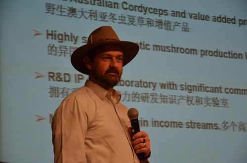 澳大利亚食用菌研究所菌种制造者兼顾问Jim Fuller(吉姆•富勒) 作出了《澳大利亚冬虫夏草市场现状及投资合作》的精彩演讲。他提到,澳大利亚所产虫草与中国青藏高原所产虫草相似度甚大,初次测验表明,两者治疗性目标化合物相同。为了证实澳大利亚虫草的药用价值,以中国公认指标为基础的附加试验正在进行中。截至目前,澳大利亚野生虫草仍未实现人工栽培,主要还是以野生为主,国内年供应80公斤虫草产品,随着更多采摘团队和地区的开发,该数字将有望提高到120-150公斤,市场上虫草销售价格在每克20美元左右。