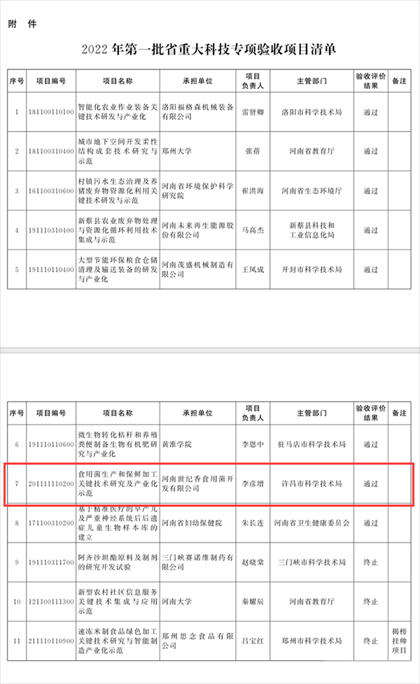 日前,河南省科学技术厅、河南省财政厅联合发文《关于公布2022年第一批省重大科技专项项目验收结果的通知》,河南世纪香食用菌开发有限公司(简称“世纪香公司”)主持,并和河南农业大学、河南省农科院资环所等单位共同承担完成的河南省重大科技创新示范专项《食用菌生产和保鲜加工关键技术研究及产业化示范》通过省级验收。这是世纪香公司在科研创新方面的又一项科技创新成果。
